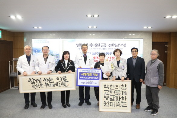 전남대학교병원은 최근 전남대병원 접견실에서 정 신 병원장, 김광석 공공부원장, 한재영 대외협력실장, 최명이 간호부장, 강정희 홍보팀장 등 병원 보직자와 이동진 작가 및 제자들이 참석한 가운데 서예작품 전달식을 가졌다.
