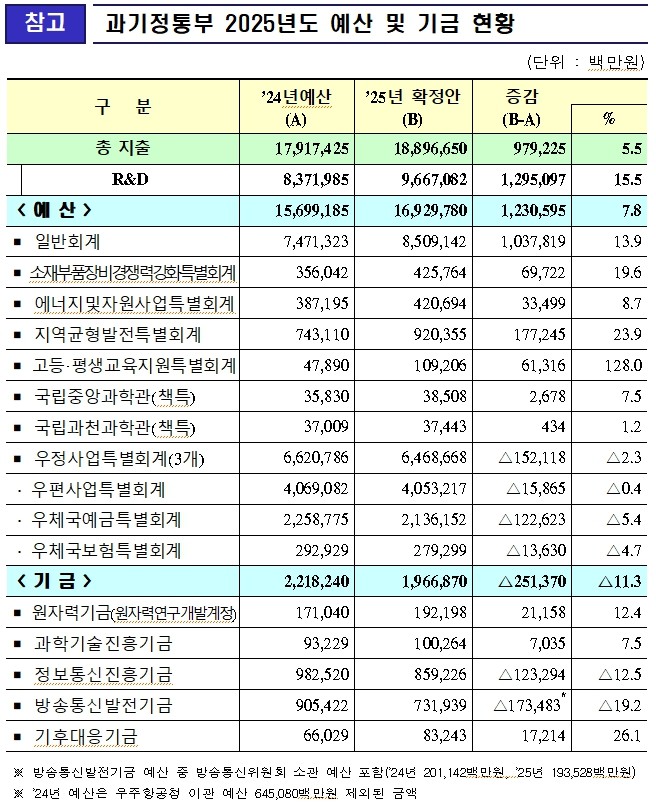 [프라임경제] 과학기술정보통신부(이하 과기정통부)는 총 18조8967억원 규모의 2025년도 예산안이 10일 국회 본회의 의결을 통해 확정됐다고 밝혔다.