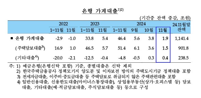 11일 한은이 발표한 '금융시장 동향'에 따르면 11월 말 기준 은행 가계대출 잔액은 전월보다 1조9000억원 증가한 1141조4000억원으로 집계됐다. 지난 3월(7000억원 감소) 이후 가장 낮은 증가폭이다.