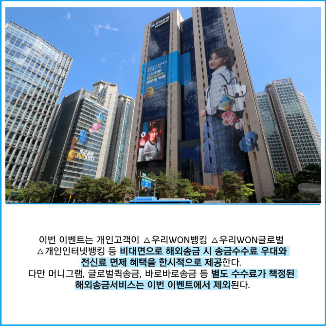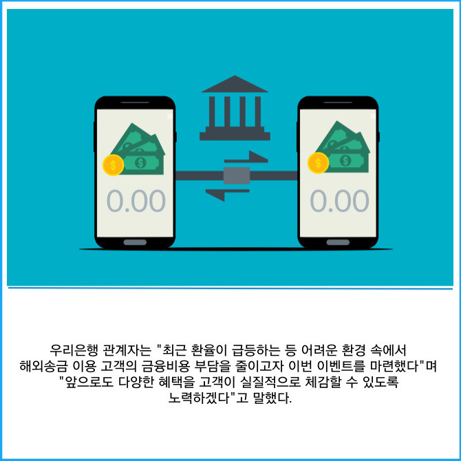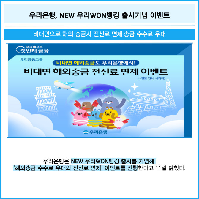 [프라임경제] 우리은행은 NEW 우리WON뱅킹 출시를 기념해 '해외송금 수수료 우대와 전신료 면제' 이벤트를 진행한다고 11일 밝혔다.