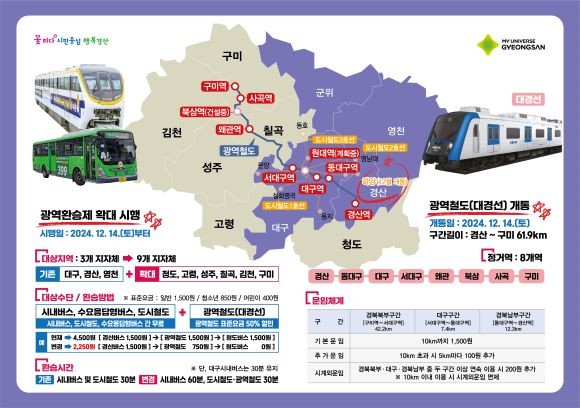 이번 대중교통 광역환승제 확대 시행으로 서비스 지역이 기존 3개 지자체(대구, 경산, 영천)에서 9개 지자체(대구, 경산, 영천, 김천, 구미, 칠곡, 고령, 성주, 청도)로 확장된다.