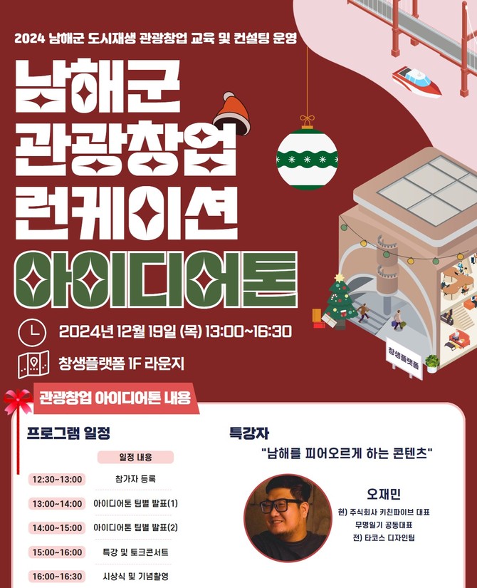 [프라임경제] 남해군 도시재생지원센터가 지역 관광자원 기반의 창업 아이디어를 발굴하기 위해 '2024 남해군 관광창업 런케이션 아이디어톤'을 12월19일 창생플랫폼에서 개최한다.