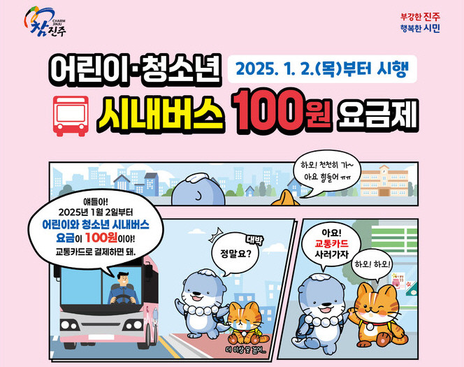 [프라임경제] 진주시가 2025년 1월2일부터 '어린이·청소년 시내버스 100원 요금제'를 시행한다.