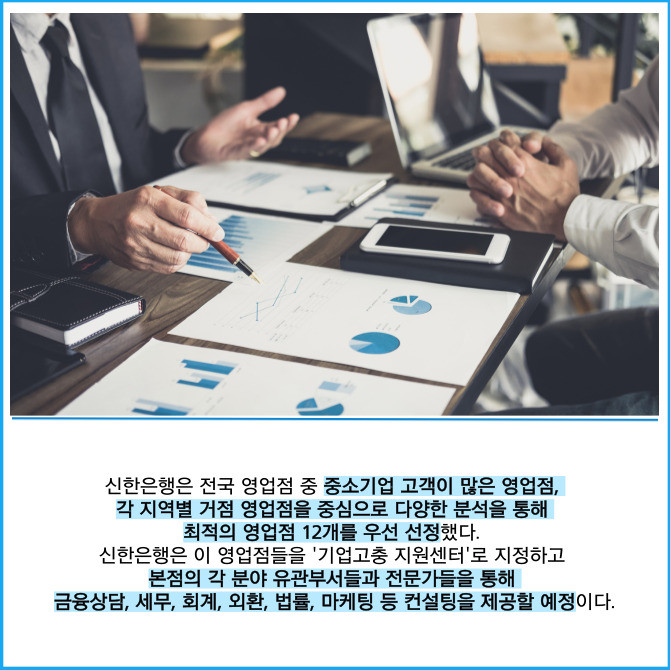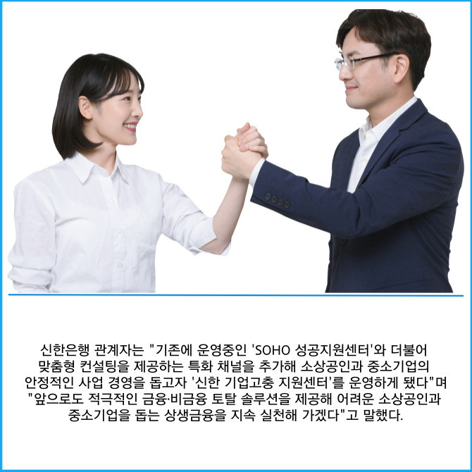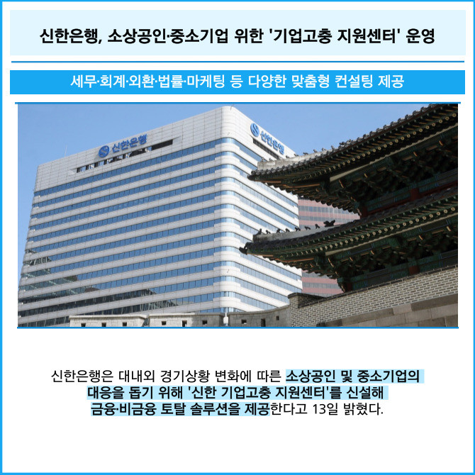 [프라임경제] 신한은행은 대내외 경기상황 변화에 따른 소상공인 및 중소기업의 대응을 돕기 위해 '신한 기업고충 지원센터'를 신설해 금융·비금융 토탈 솔루션을 제공한다고 13일 밝혔다.