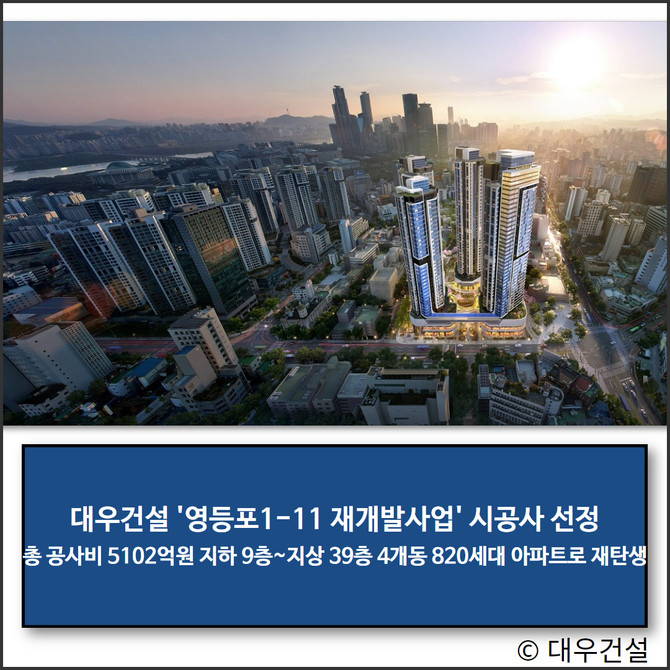 영등포1-11 재개발 사업은 1만1961㎡의 부지에 지하 9층~지상 39층 4개동 820세대 규모의 공동주택을 신축하는 사업이다. 총 공사금액은 5102억원 규모다.