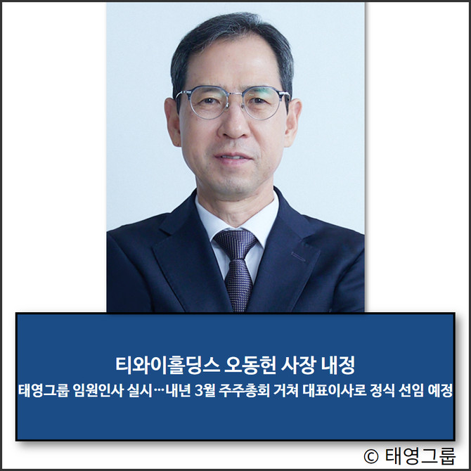 태영그룹(009410) 지주회사인 티와이홀딩스가 16일 이사회를 열어 오동헌 부사장 겸 비서실장을 사장 승진과 함께 티와이홀딩스 대표이사로 내정했다.