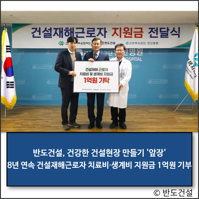 반도건설은 2017년부터 매년 진행해 온 '건설재해근로자 치료비 및 생계비 지원금 전달식'을 근로복지공단 안산병원에서 진행했다. 반도건설은 총 305명의 치료비 및 생계비 8억원을 지원했으며, 2025년에도 약 40여명의 재해근로자를 지원할 계획이다.
