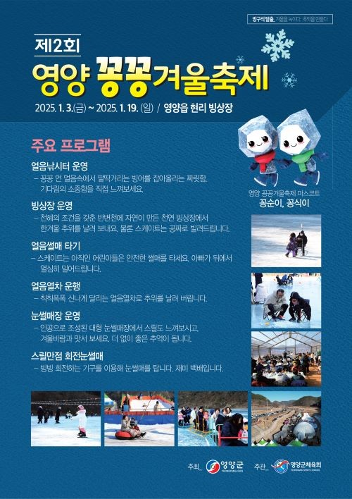 영양군 관계자는 "올 겨울에도 '제2회 영양 꽁꽁 겨울축제'에서 스케이트장, 얼음열차를 포함한 다양한 액티비티, 라면, 어묵 등 다양한 먹거리를 즐기며 후끈한 겨울을 보내길 바란다"고 말했다.
