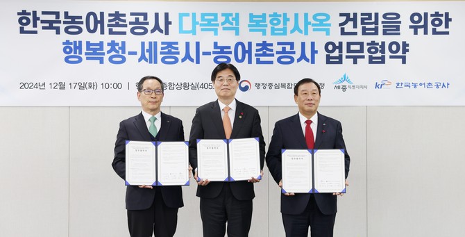 [프라임경제] 세종시(시장 최민호)는 17일 행정중심복합도시건설청(행복청), 한국농어촌공사와 함께 '한국농어촌공사 다목적 복합사옥 건립'을 위한 업무협약을 체결했다.