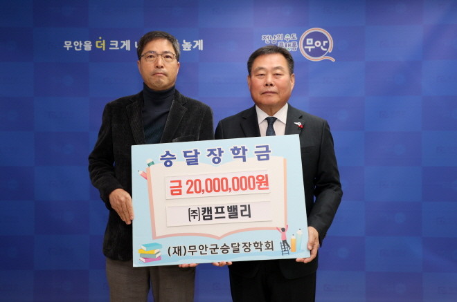 [프라임경제] 전남 무안군(군수 김산)은 최근 ㈜캠프밸리가 지역 인재 육성을 위해 (재)무안군승달장학회에 장학금 2000만원을 기탁했다고 밝혔다.
