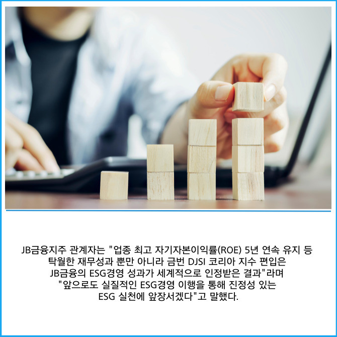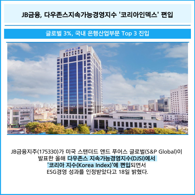 [프라임경제] JB금융지주(175330)가 미국 스탠더드 앤드 푸어스 글로벌(S&P Global)이 발표한 올해 다우존스 지속가능경영지수(DJSI)에서 '코리아 지수(Korea Index)'에 편입되면서 ESG경영 성과를 인정받았다고 18일 밝혔다.