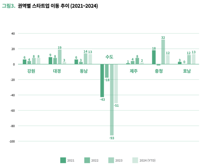 반면, 비수도권 지역에서는 △호남권 △동남권 △강원권 등의 스타트업의 순유입이 증가하는 양상이 나타났다.