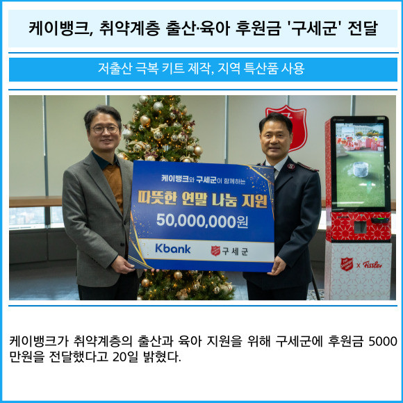 [프라임경제] 케이뱅크가 취약계층의 출산과 육아 지원을 위해 구세군에 후원금 5000만원을 전달했다고 20일 밝혔다.