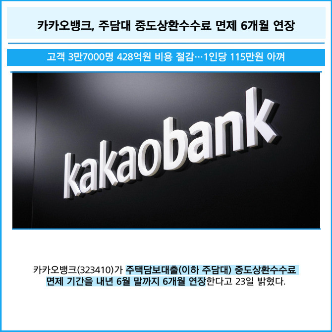[프라임경제] 카카오뱅크(323410)가 주택담보대출(이하 주담대) 중도상환수수료 면제 기간을 내년 6월 말까지 6개월 연장한다고 23일 밝혔다.