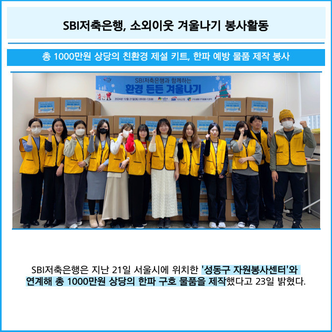 [프라임경제] SBI저축은행은 지난 21일 서울시에 위치한 '성동구 자원봉사센터'와 연계해 총 1000만원 상당의 한파 구호 물품을 제작했다고 23일 밝혔다.