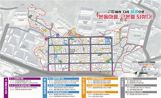 부산진구 개금3동은 보도 확장, 가로등 설치, 골목길 개선과 같은 도로 정비와 함께 주차장, 도서관, 쌈지공원 등 주민 편의시설을 확충한다.