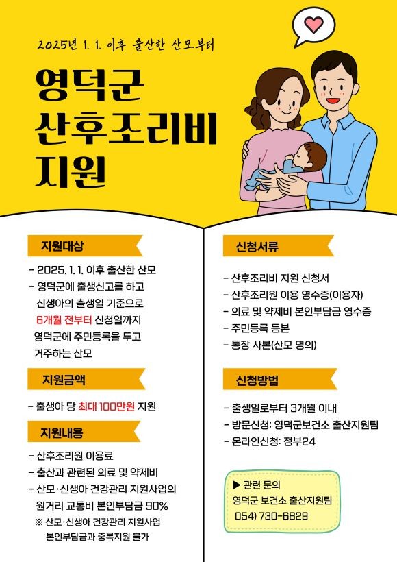 지원 대상은 2025년 1월 1일 이후 출산한 산모로, 영덕군에 출생신고를 하고 출산일 기준 6개월 전부터 신청일까지 영덕군에 주민등록을 두고 거주해야 한다.