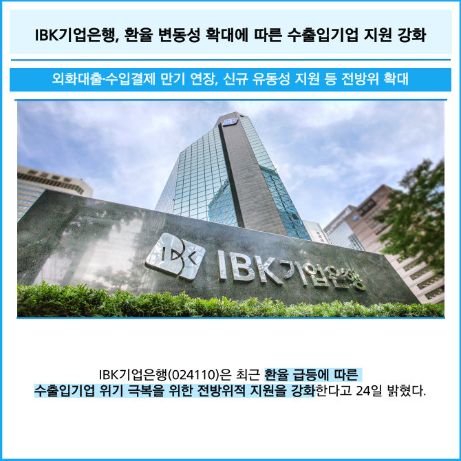 [프라임경제] IBK기업은행(024110)은 최근 환율 급등에 따른 수출입기업 위기 극복을 위한 전방위적 지원을 강화한다고 24일 밝혔다.