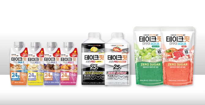 현재 테이크핏 라인업은 소비자의 다양한 목적과 취향을 충족하기 위해 총 8종의 제품으로 구성돼 있다. 이번 24g 증량 리뉴얼 제품인 △테이크핏 맥스(250㎖) 4종과 △운동 전에 마시면 효과적인 아르지닌과 카페인을 첨가한 테이크핏 프로(450㎖) 2종 △얼음컵에 담아 마실 수 있는 파우치 형태의 테이크핏 아쿠아(230㎖) 2종 등이다.
