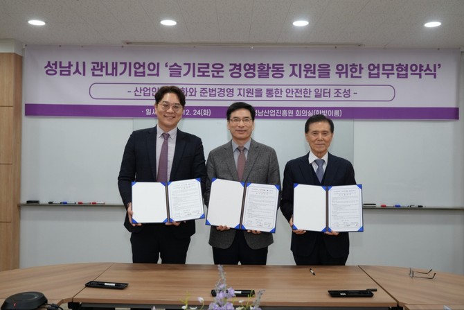 [프라임경제] 성남산업진흥원(원장 이의준)이 재단법인 피플(이사장 이영순), 법무법인 사람앤스마트(대표번호사 이기윤)와 성남시 관내 기업의 산업안전 문화정착과 준법경영 강화를 위해 업무협약을 체결했다고 26일 밝혔다.