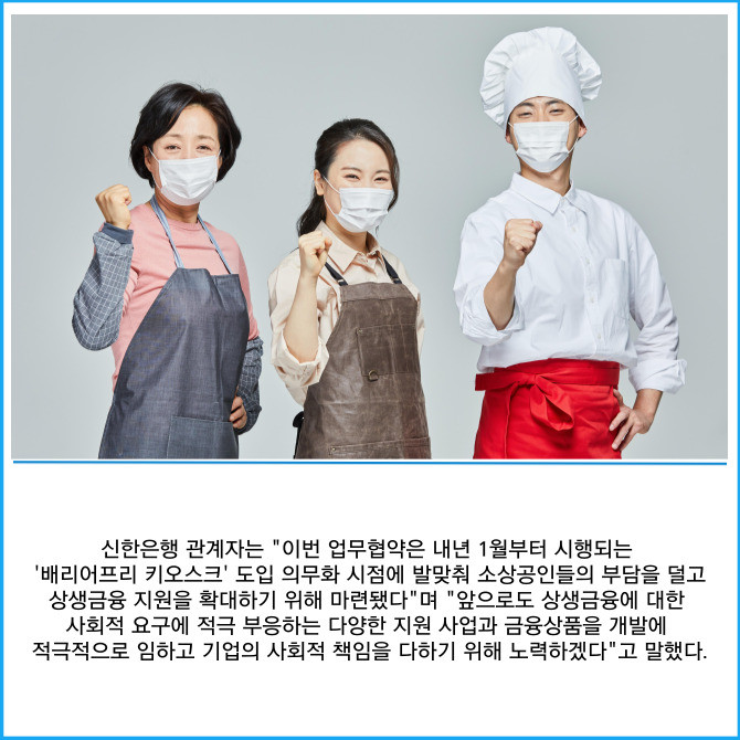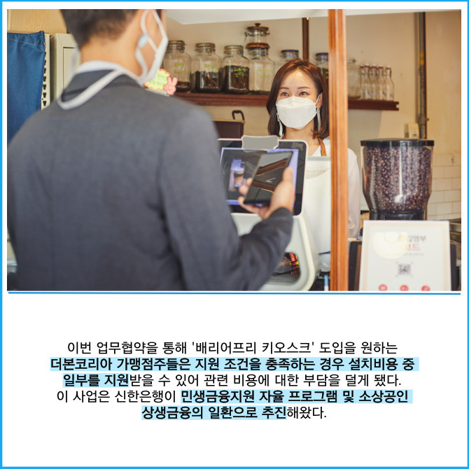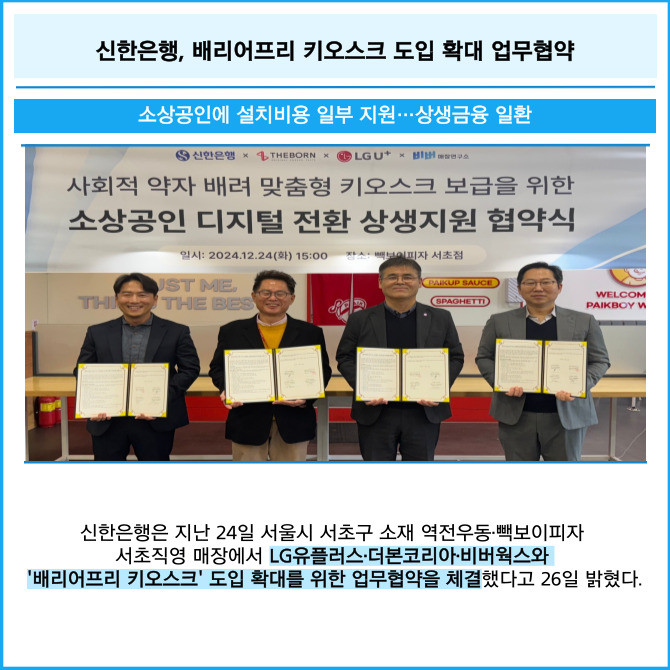 [프라임경제] 신한은행은 지난 24일 서울시 서초구 소재 역전우동·빽보이피자 서초직영 매장에서 LG유플러스·더본코리아·비버웍스와 '배리어프리 키오스크' 도입 확대를 위한 업무협약을 체결했다고 26일 밝혔다.
