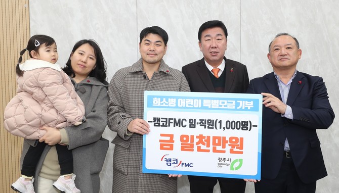 [프라임경제] 캠코FMC(대표이사 봉종근)는 26일 충북 청주시 흥덕구 옥산면에 거주하는 희귀난치병 투병 아동 전사랑(3세) 양을 지원하기 위해 성금 1000만원을 기탁했다.