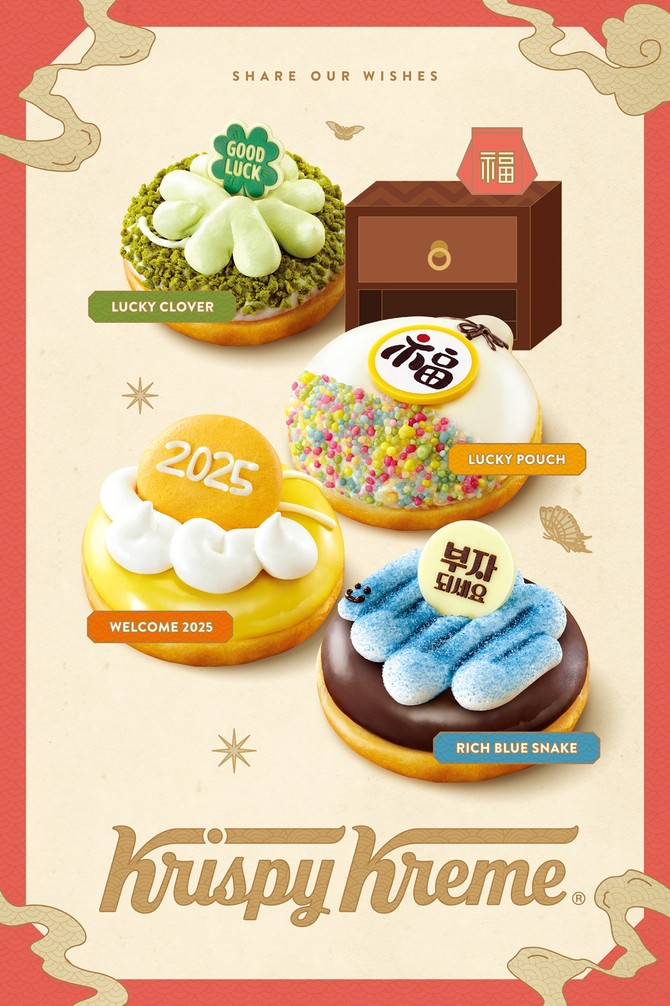 롯데GRS가 운영하는 도넛 프랜차이즈 브랜드 크리스피크림 도넛이 2025년 푸른 뱀의 해를 맞아 소망하는 소원을 함께 나눈다는 'SHARE OUR WISHES' 컨셉으로 신제품 'New Year Wish' 도넛 4종을 출시한다.