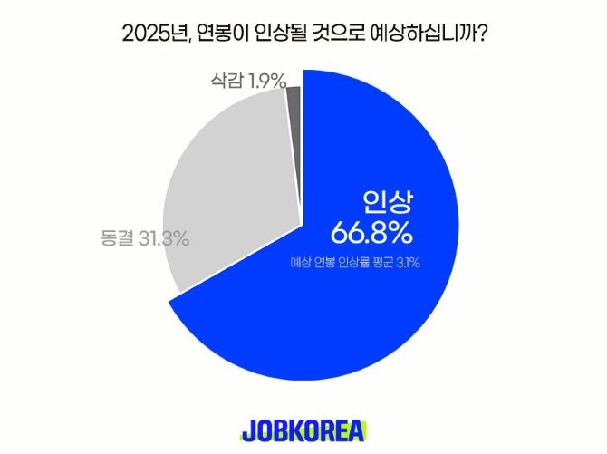 잡코리아와 AI매칭 솔루션 '원픽'은 27일 '2025년 기업 규모별 연봉 인상률'에 대한 조사 결과를 발표했다. 남녀 직장인 1639명을 대상으로 실시된 조사에서 직장인 66.8%는 '2025년 본인의 연봉이 인상될 것'으로 기대한다고 답했다. 31.3%는 연봉 동결, 1.9%는 연봉이 삭감될 것이라고 응답했다.
