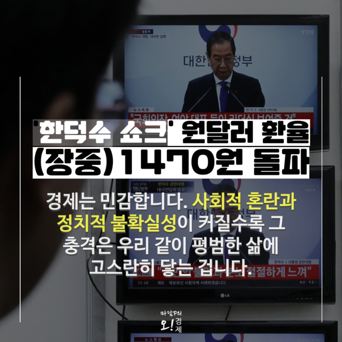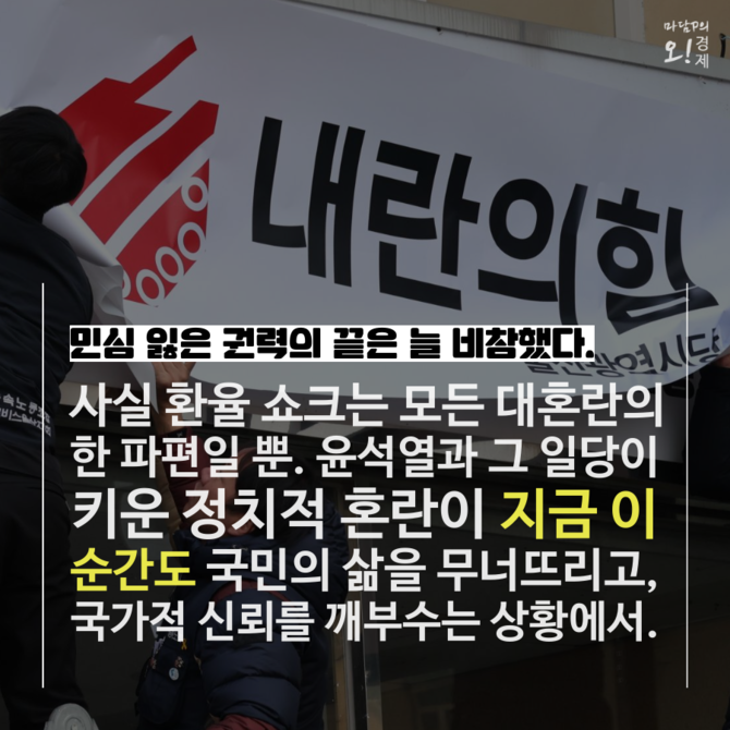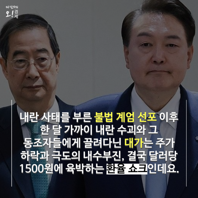 내란 사태를 부른 불법 계엄 선포 이후 한 달 가까이 내란 수괴와 그 동조자들에게 끌려 다닌 대가는 주가 하락과 극도의 내수 부진, 결국 달러당 1500원에 육박하는 환율 쇼크로 돌아왔다.