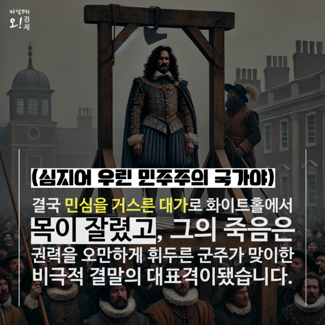 찰스 1세는 세금 징수 승인 권한을 가진 의회를 적으로 돌리고, 군사력을 동원해 권력을 지키려 했다. 결국 민심을 거스른 대가로 화이트홀에서 목이 잘렸는데 그의 죽음은 권력을 오만하게 휘두른 군주가 맞이한 비극적 결말의 대표격이다.