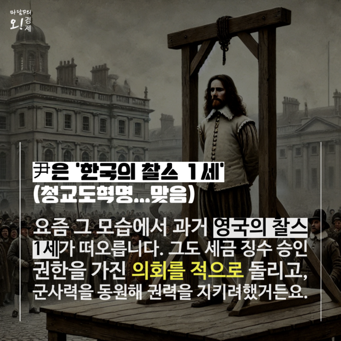 이 모든 혼란의 중심에 윤석열 대통령 부부가 있다. 제1 야당을 "패악질" 부리는 적으로 규정하고, 불법 계엄령으로 문제를 통제하려 한 그들이다. 그 모습에서 문득 과거 영국의 찰스 1세가 떠올랐다.