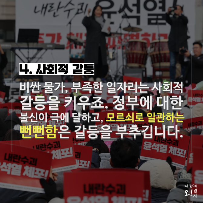 가장 비싼 대가는 사회적 갈등 심화다. 비싼 물가, 부족한 일자리는 개인과 세대, 성별을 불문하고 갈등을 키운다. 정부에 대한 불신은 극에 달하고, 모르쇠로 일관하는 뻔뻔함이 그 갈등을 먹이 삼아 본인들의 '몸 보신'에 집중할수록 사회적 혼란은 가중된다.