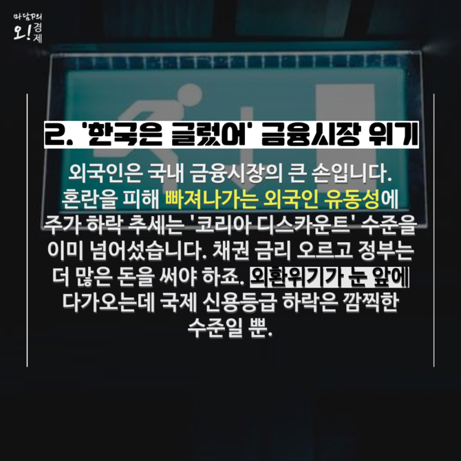 다음은 외국인 탈출 러시에 따른 금융시장의 위기다. 외국인은 국내 금융시장의 큰 손이다. 혼란을 피해 빠져나가는 외국인 유동성에 주가 하락은 '코리아 디스카운트' 수준을 이미 넘어섰다. 채권 금리는 오르고, 정부는 더 많은 돈을 써야 한다. 외환위기가 눈 앞에 다가오는 상황에서 국제 신용등급 하락은 깜찍한 수준이다.