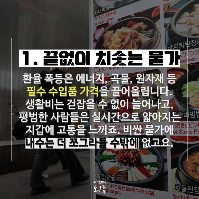 원달러 환율 1500원 되면 어떤 일이 벌어질까. 먼저 끝없이 치솟는 물가다. 환율 폭등은 에너지, 곡물, 원자재 같은 필수 수입품 가격을 끌어올린다. 생활비는 걷잡을 수 없이 늘어나고, 평범한 사람들은 실시간으로 얇아지는 지갑에 고통을 느낀다. 비싼 물가에 내수는 더 쪼그라든다.