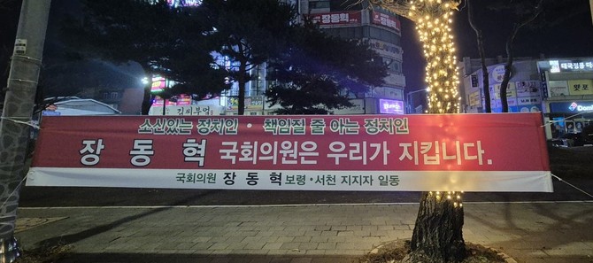 이러한 상황 속에서 장 의원의 지지자들은 "소신 있는 정치인, 책임질 줄 아는 정치인 장동혁 국회의원은 우리가 지킵니다"라는 문구의 현수막을 게시하며 반박했다. 해당 현수막은 장 의원 지지자들이 주도한 것으로 보인다. 장 의원 측은 "정당 현수막 외에 게시한 현수막은 지지자들에 의해 게시된 것"이라고 밝혔다.