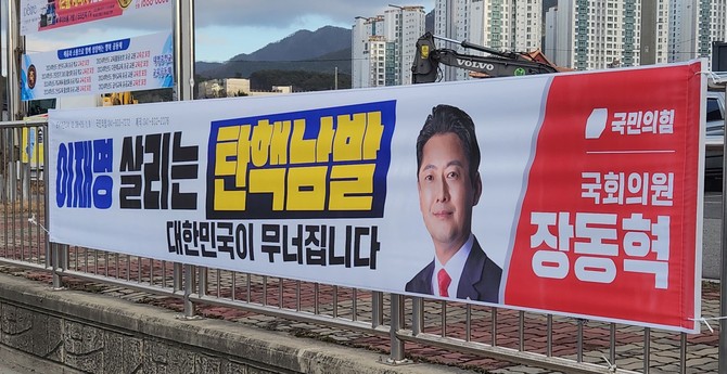 장 의원은 윤석열 대통령 탄핵 반대 입장을 밝히며, '투표 불참' 등의 논란을 일으킨 뒤, 더불어민주당과 정의당 등 진보정당을 겨냥한 현수막을 게시했다. 하지만 이에 대한 반발이 거세지고 있다.
