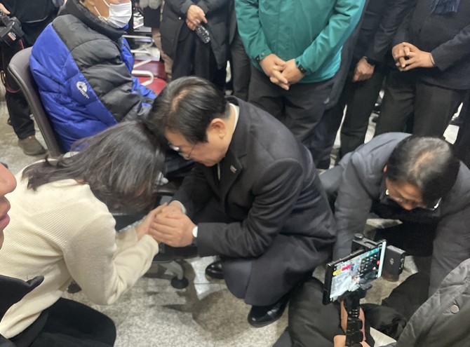 [프라임경제] 29일 무안국제공항에서 더불어민주당 대표가 유가족을 위로하고 있다.
