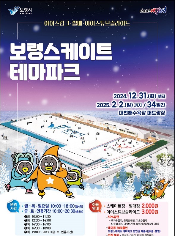 보령시는 오는 12월31일부터 내년 2월2일까지 대천해수욕장 머드광장에서 '보령스케이트 테마파크장'을 운영한다고 밝혔다.