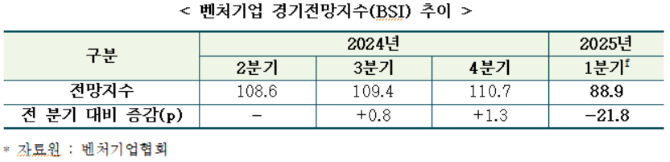 2025년 연간 벤처기업 경기전망지수(BSI)는 93.6으로 조사됐다, 이는 내년 1분기 벤처기업 경기전망지수(88.9)보다 높은 수준이다. 연간 전망은 1분기 대비 긍정적인 것으로 나타났다.