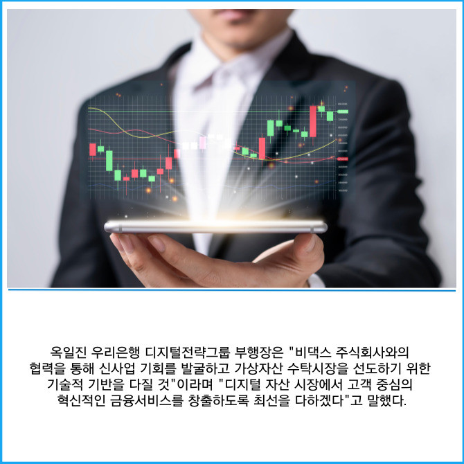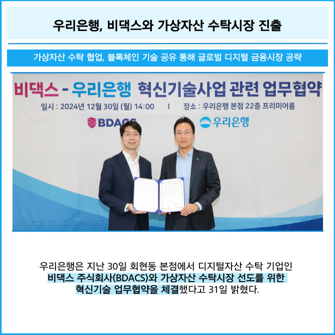 [프라임경제] 우리은행은 지난 30일 회현동 본점에서 디지털자산 수탁 기업인 비댁스 주식회사(BDACS)와 가상자산 수탁시장 선도를 위한 혁신기술 업무협약을 체결했다고 31일 밝혔다.