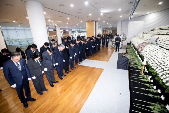 [프라임경제] 경북도의회 박성만 의장과 도의원, 의회사무처 직원들은 31일 도청 동락관 1층에 마련된 '제주항공 여객기 사고 사망자 합동분향소'를 찾아 헌화와 묵념을 하며 사고 희생자의 넋을 기렸다.