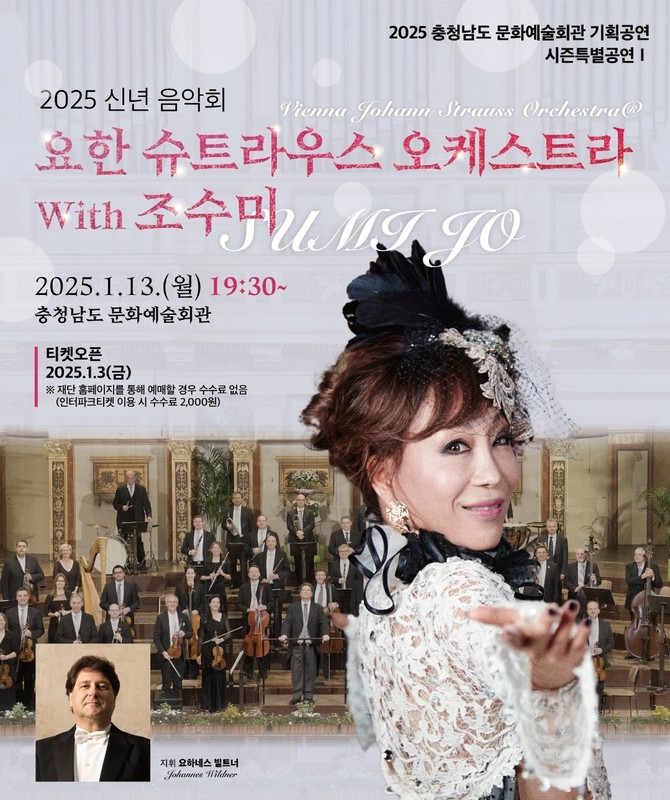 [프라임경제] 충남문화관광재단(대표이사 서흥식)은 2025년 새해를 맞아 1월13일 오후 7시30분, 충청남도 문화예술회관에서 '요한 슈트라우스 오케스트라 With 조수미: 2025 신년 음악회'를 개최한다고 밝혔다.