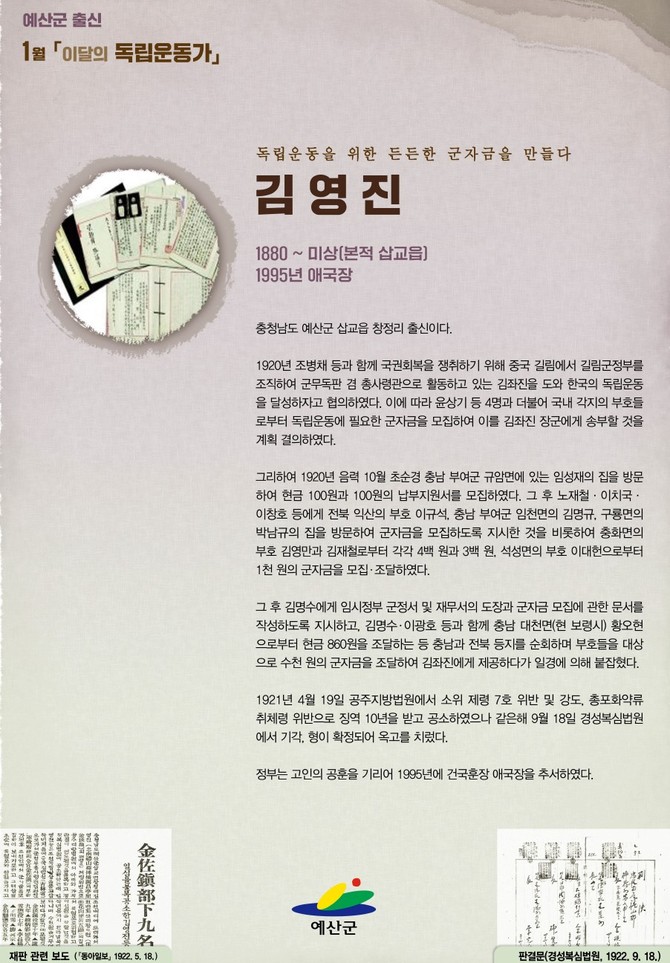 [프라임경제] 충남 예산군은 일제강점기 군자금 모집 활동을 통해 독립운동에 기여한 김영진을 '2025년 1월 이달의 독립운동가'로 선정했다고 밝혔다.