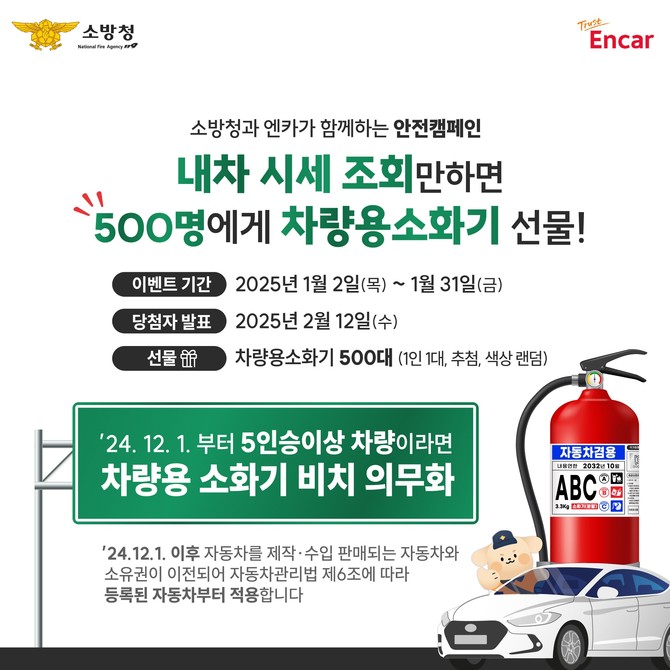 소방청과 엔카닷컴은 이를 홍보하며, 캠페인을 통해 엔카닷컴 앱에서 차량 시세를 조회한 500명을 선정, 차량용 소화기를 증정한다. 참여자는 엔카 앱 메인 화면의 '엔카 비교견적' 메뉴에서 '내 차 시세 조회하기' 후 화면을 캡쳐(저장), 이벤트 참여 페이지에서 참여자 정보를 입력하고 이미지를 업로드하면 된다.
