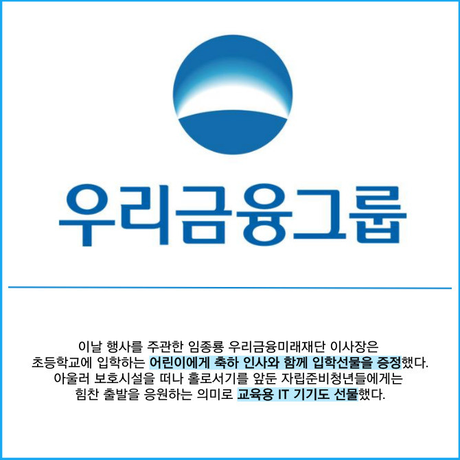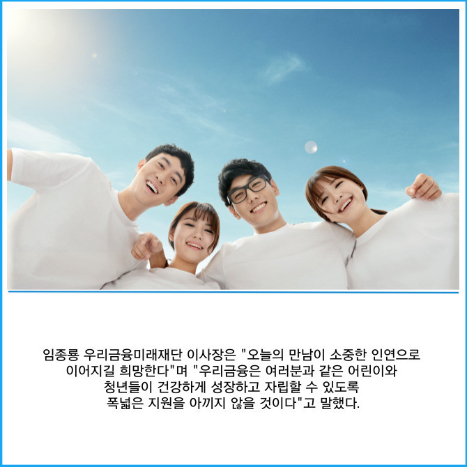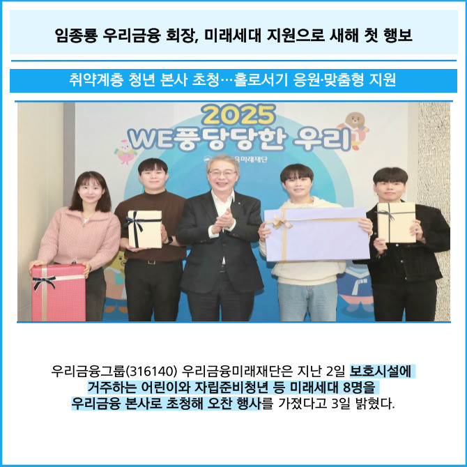[프라임경제] 우리금융그룹(316140) 우리금융미래재단은 지난 2일 보호시설에 거주하는 어린이와 자립준비청년 등 미래세대 8명을 우리금융 본사로 초청해 오찬 행사를 가졌다고 3일 밝혔다.