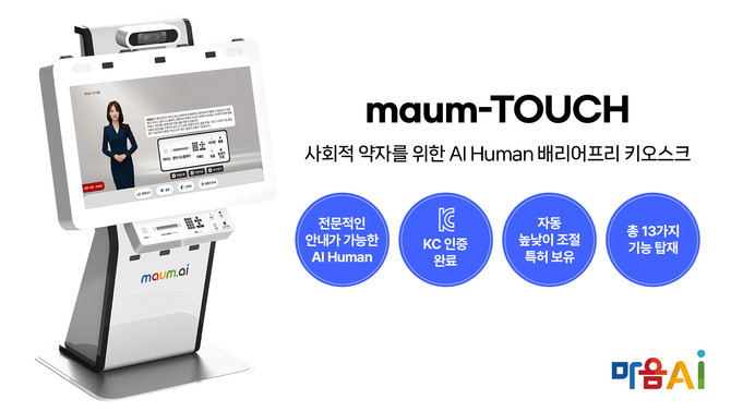 [프라임경제] 임바디드 AI(EAI·Embodied AI) 선도 기업 마음AI(377480)는 자사의 배리어프리 키오스크 '마음터치(maum-TOUCH)'가 벤처창업기업제품으로 최종 지정되며 공공 조달 시장 진출의 강력한 발판을 마련했다고 3일 밝혔다.