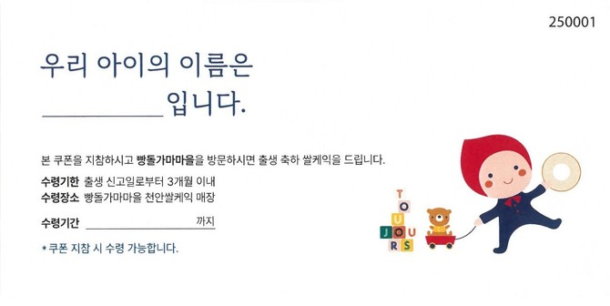 출산 가정은 교환 쿠폰을 발급받아 3개월 이내에 뚜쥬루과자점 빵돌가마마을(신방동)에서 쌀케이크로 교환할 수 있다.