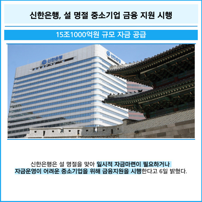 [프라임경제] 신한은행은 설 명절을 맞아 일시적 자금마련이 필요하거나 자금운영이 어려운 중소기업을 위해 금융지원을 시행한다고 6일 밝혔다.