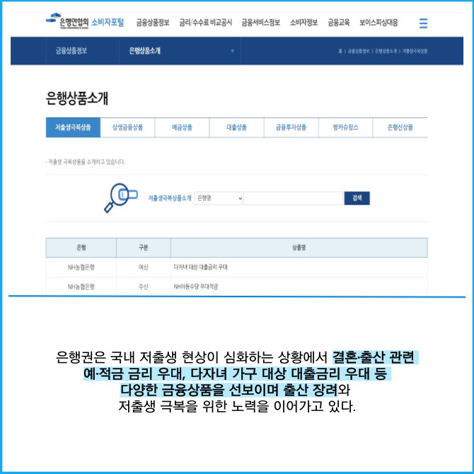[프라임경제] 은행연합회는 소비자들이 자신의 상황에 맞는 은행권의 저출생 극복 상품을 손쉽게 비교하고 검색할 수 있도록 지원하는 '저출생 극복 상품 공시 사이트'를 출시했다고 6일 밝혔다.