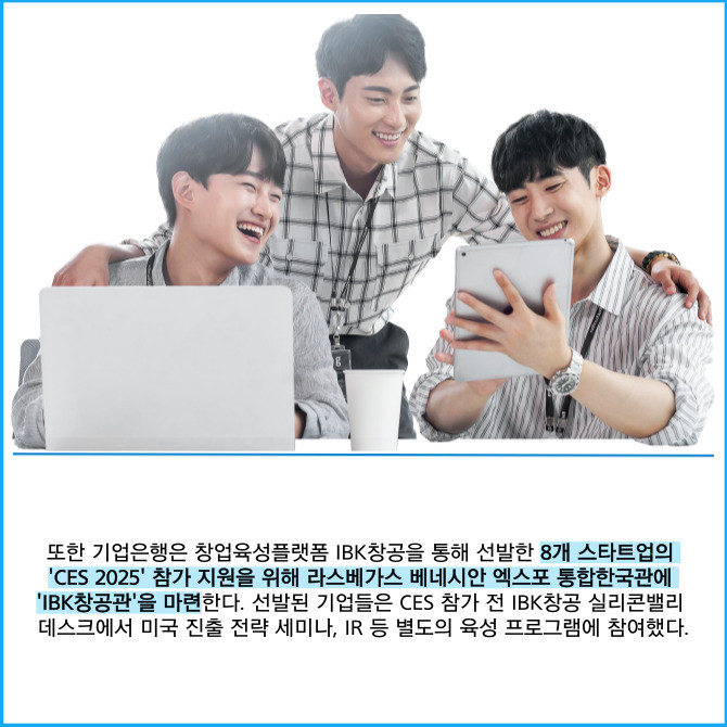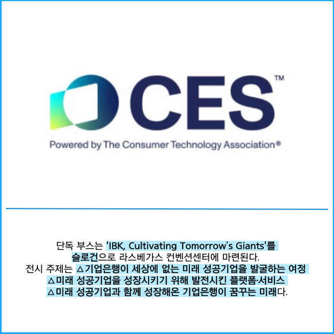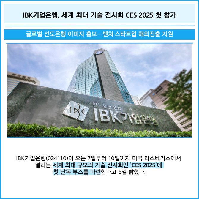 [프라임경제] IBK기업은행(024110)이 오는 7일부터 10일까지 미국 라스베가스에서 열리는 세계 최대 규모의 기술 전시회인 'CES 2025'에 첫 단독 부스를 마련한다고 6일 밝혔다.
